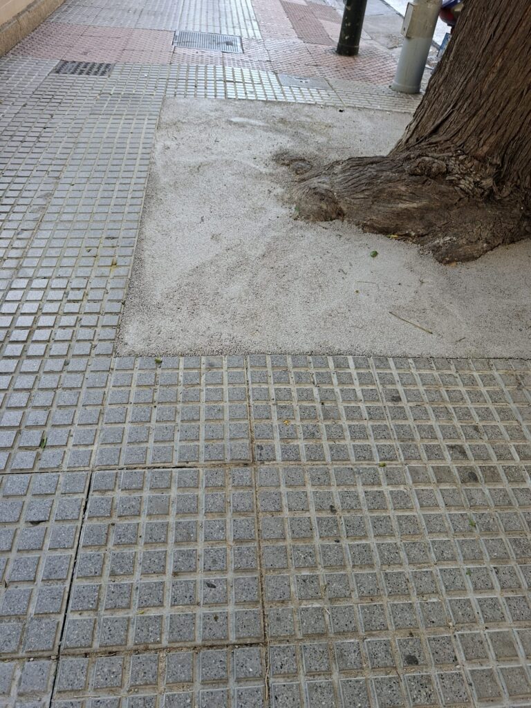 En la Avenida Ana de Viya en la acera del Hospital Puerta del Mar junto a paso de peatones que accede a la Escuela de Enfermería hay varias losas rotas y levantadas quedando muy poco espacio para el paso de peatones y sillas de discapacitados. Estas losas están pegadas al alcorque de un árbol con gran raiz que debería rellenarse con material adecuado para facilitar el paso de las numerosas personas que transitan cada día por allí.