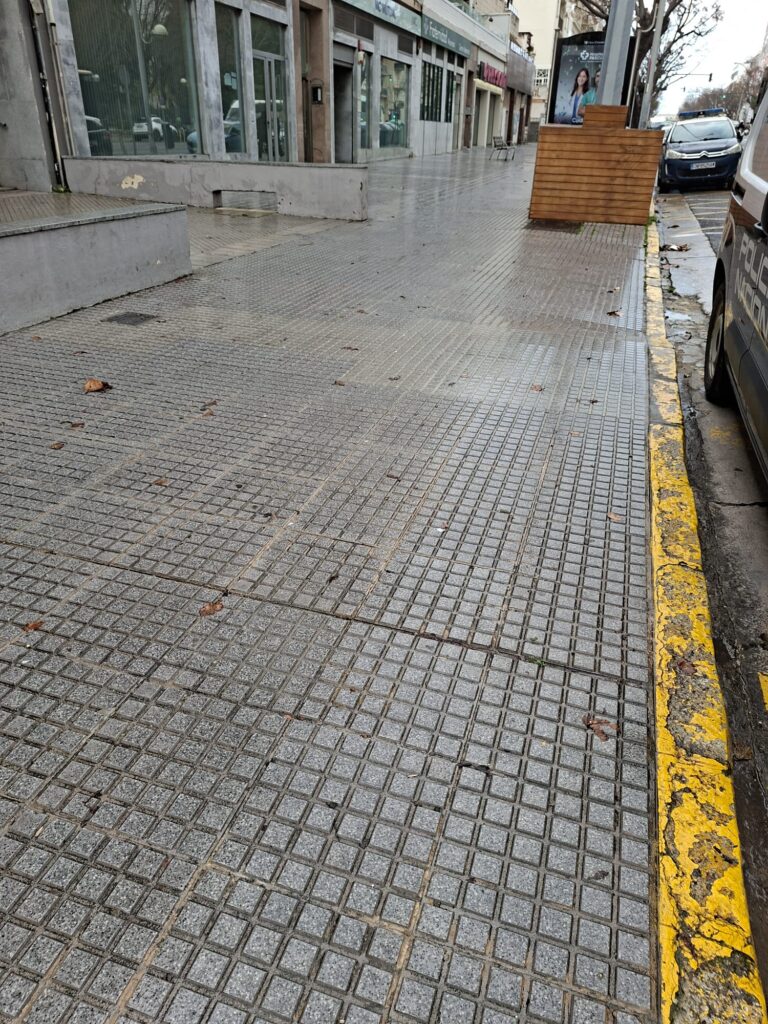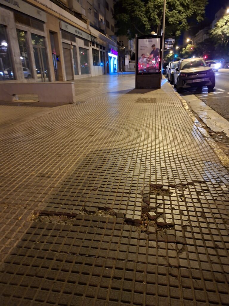 En la acera de la Avenida de Andalucía junto a la Comisaría de la Policía Nacional faltan losas y hay losas rotas que dificultan el paso y pueden provocar caídas.